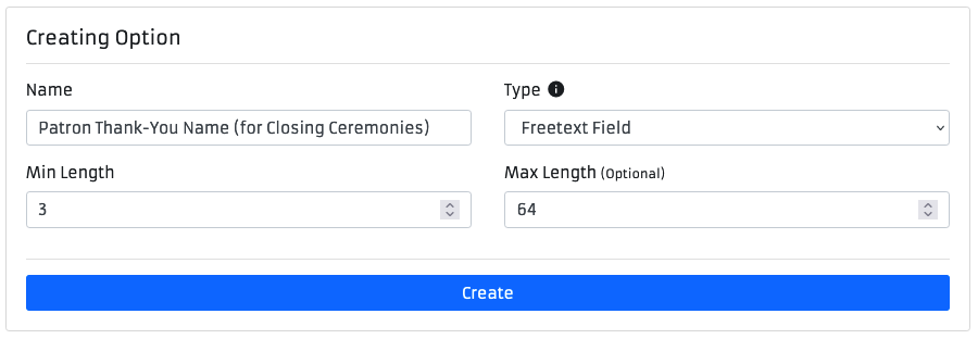 - Freetext Field - An text input field that the attendee can enter their own value, with a customizable minimum and maximum length.